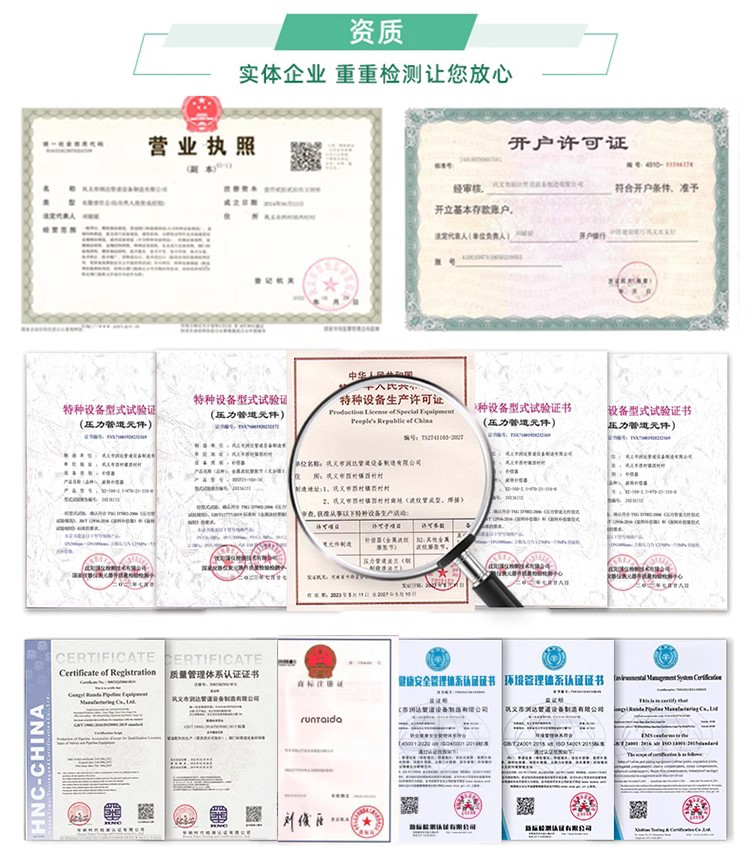 公司注冊(cè)商標(biāo)“潤(rùn)泰達(dá)”。 公司通過(guò)ISO9001:2008質(zhì)量管理體系認(rèn)證,行業(yè)十幾年生產(chǎn)經(jīng)驗(yàn),多年工藝與品質(zhì)積累,只為給您提供更好的管道產(chǎn)品。公司設(shè)有嚴(yán)格的質(zhì)量控制體系,標(biāo)準(zhǔn)的生產(chǎn)工藝流程,規(guī)范的出廠檢測(cè)手段,確保出廠的產(chǎn)品達(dá)到標(biāo)準(zhǔn)和客戶的要求。 潤(rùn)達(dá)管道企業(yè)使命: 讓管線運(yùn)行更安全 企業(yè)愿景: 1.創(chuàng)建有夢(mèng)想、有文化、有情有義的現(xiàn)代化企業(yè) 2.尊重個(gè)人、成就員工