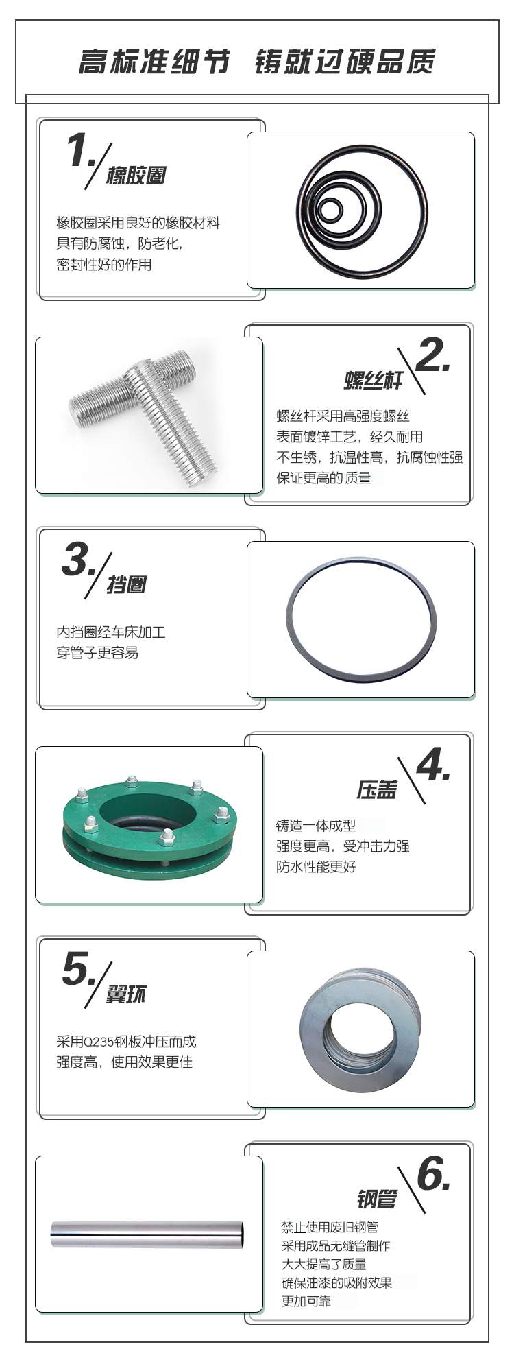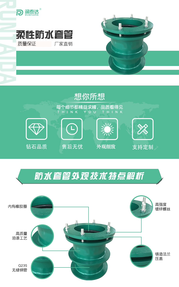 一般在做水池的時候要用到套管,它是管道通向水池的通道。但是普通的套管很難密封,以致套管與管道之間會有漏水、套管與墻壁之間也易漏水。只用防水套管,可以解決套管與墻壁之間的漏水,但不能解決套管與管道之間的密封,柔性防水套管正好可以解決兩種問題。