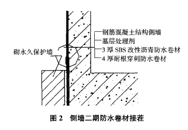 底板部位的卷材與永久性保護墻的接觸部位應空鋪或適當點粘(以適應結構的不均勻沉降),永久性保護墻頂面預留甩茬的卷材上面蓋兩皮磚進行臨時保護,待二期接茬時拆掉臨時保護墻,與外墻卷材進行搭接。側墻二期防水卷材接茬示意見圖2。
