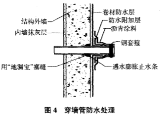 本身未做超前止水處理,所以該類穿墻管道很容易滲漏,本工程防水處理見圖4。